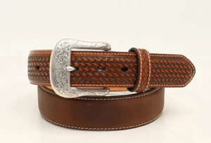 Brown Distressed Leather Belt with Basketweave Stamped Tabs Outlind in Silver Nailheads.