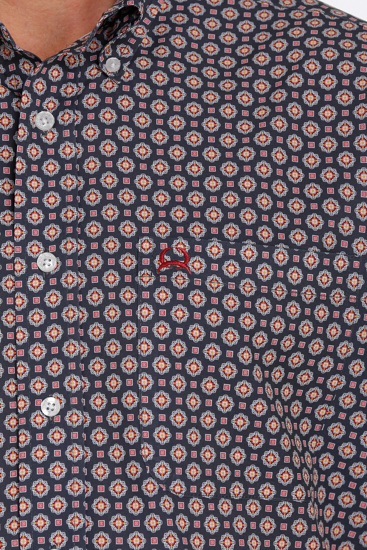 Navy, Orange and Red Medallion Print Short Sleeve Arenaflex Button Down Shirt.