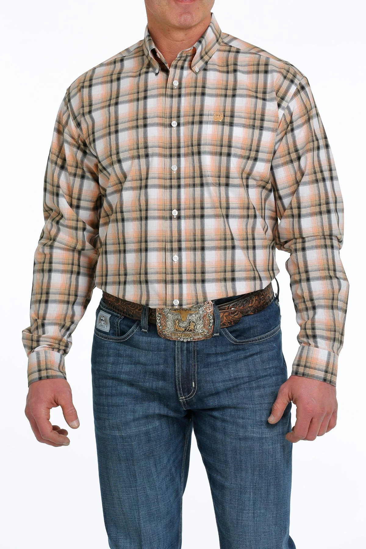 White, Orange and Khaki Plaid Long Sleeve Button Down Shirt.