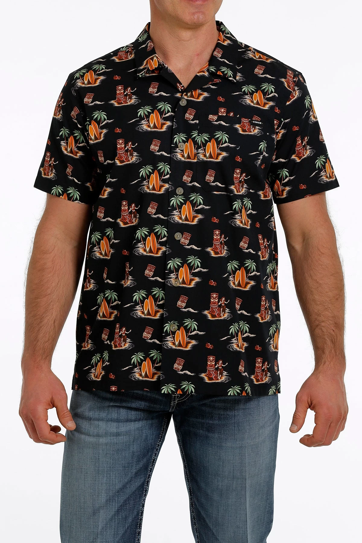 Black with All Over Tiki Print Short Sleeve Button Down Shirt.