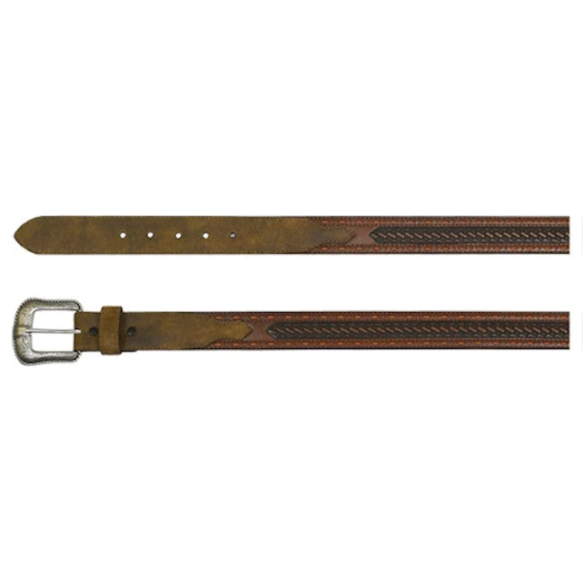 Brown Leather Basket Weave Western Belt with Laser Cut Edge Detail and Orange Inlay.