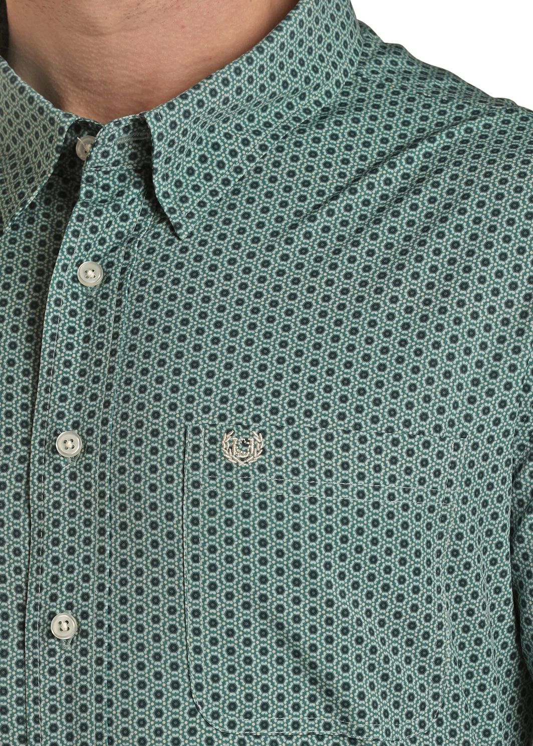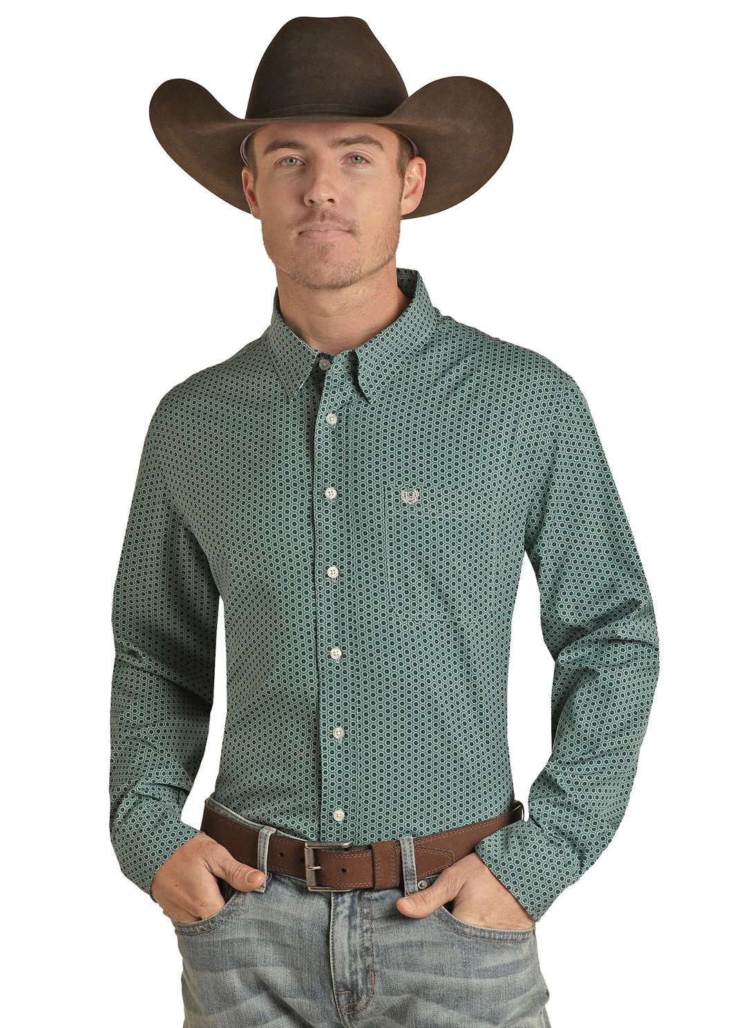 Green and Blue Geometric Print Long Sleeve Button Down Shirt.
