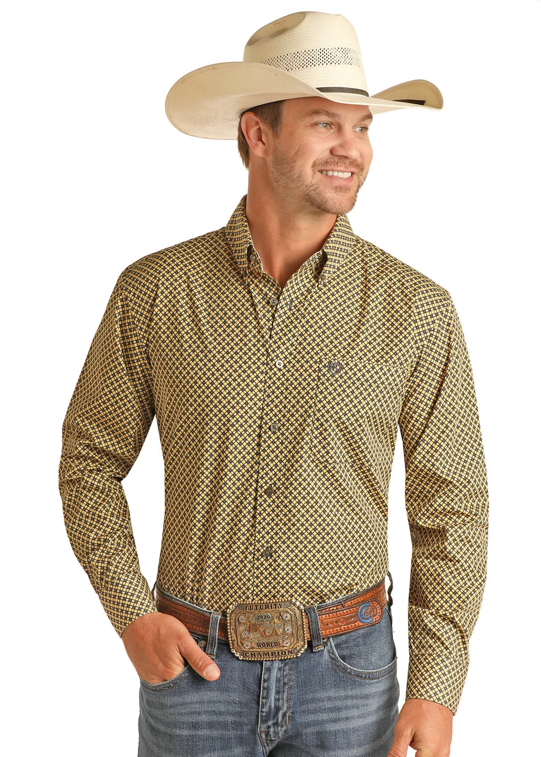 Yellow and Black Plaid Long Sleeve Button Down Shirt.