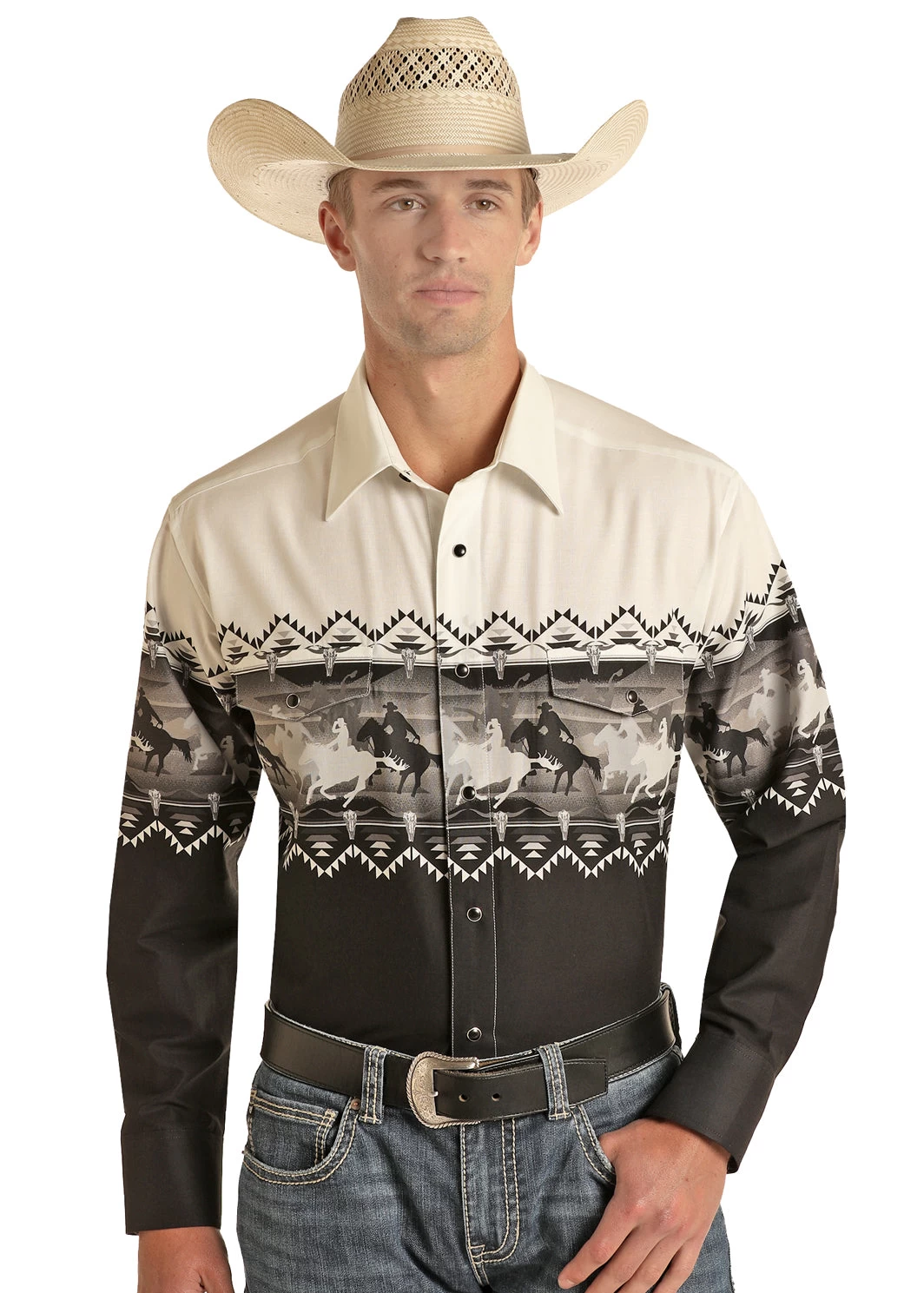 Black and White Running Horse Border Print Long Sleeve Snap Front Shirt.