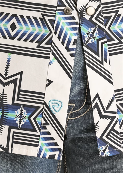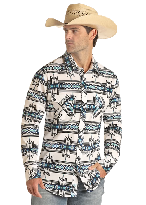 White with Blue and Grey Aztec Print Long Sleeve Snap Front Shirt.