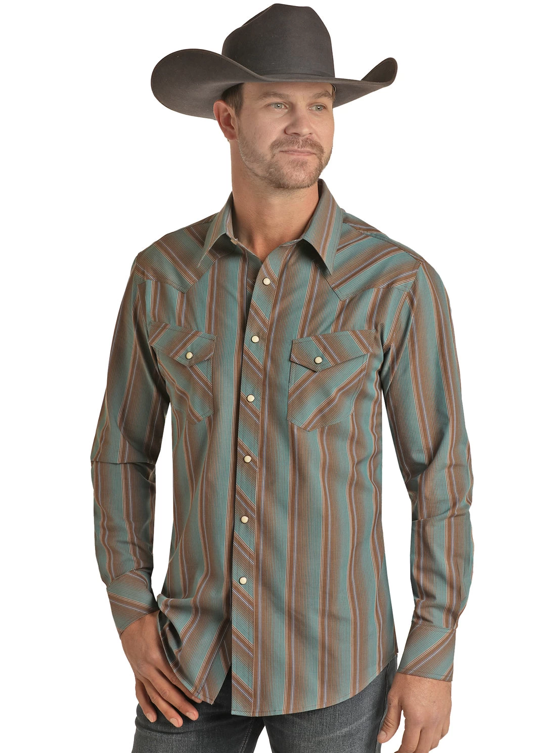 Turquoise and Brown Vintage Serape Long Sleeve Snap Front Shirt.