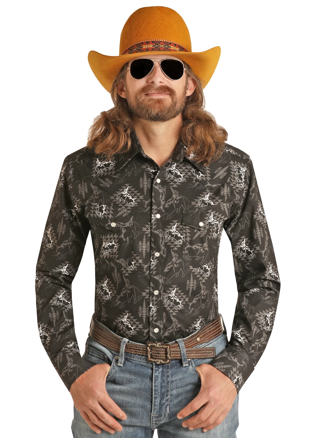 Black and Grey All Over Aztec Print with Bull Rider Overprint Long Sleeve Snap Front Shirt.