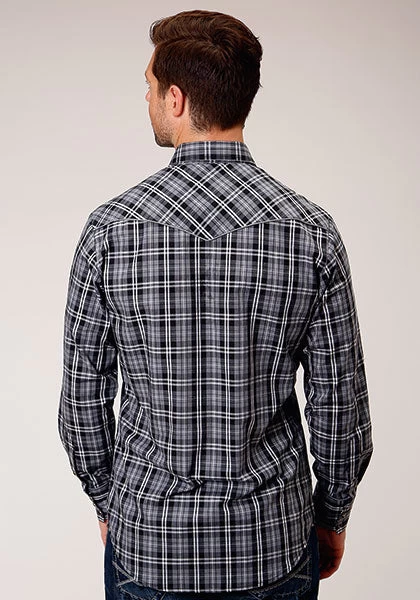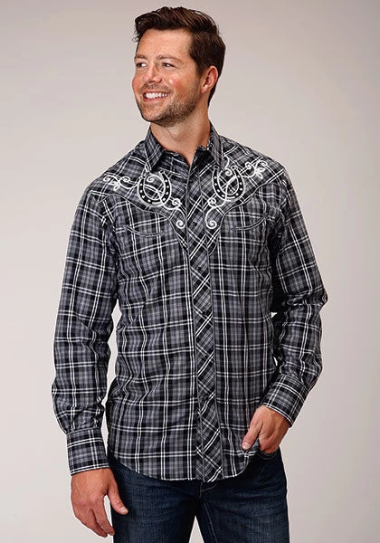 Grey, Black and White Plaid Long Sleeve Snap Front Shirt with Horseshoe and Scroll Embroidered Yokes.