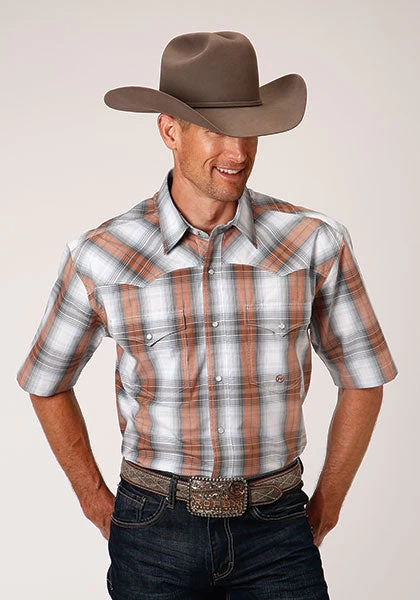Dusk and Grey Ombre Plaid Short Sleeve Snap Front Shirt.