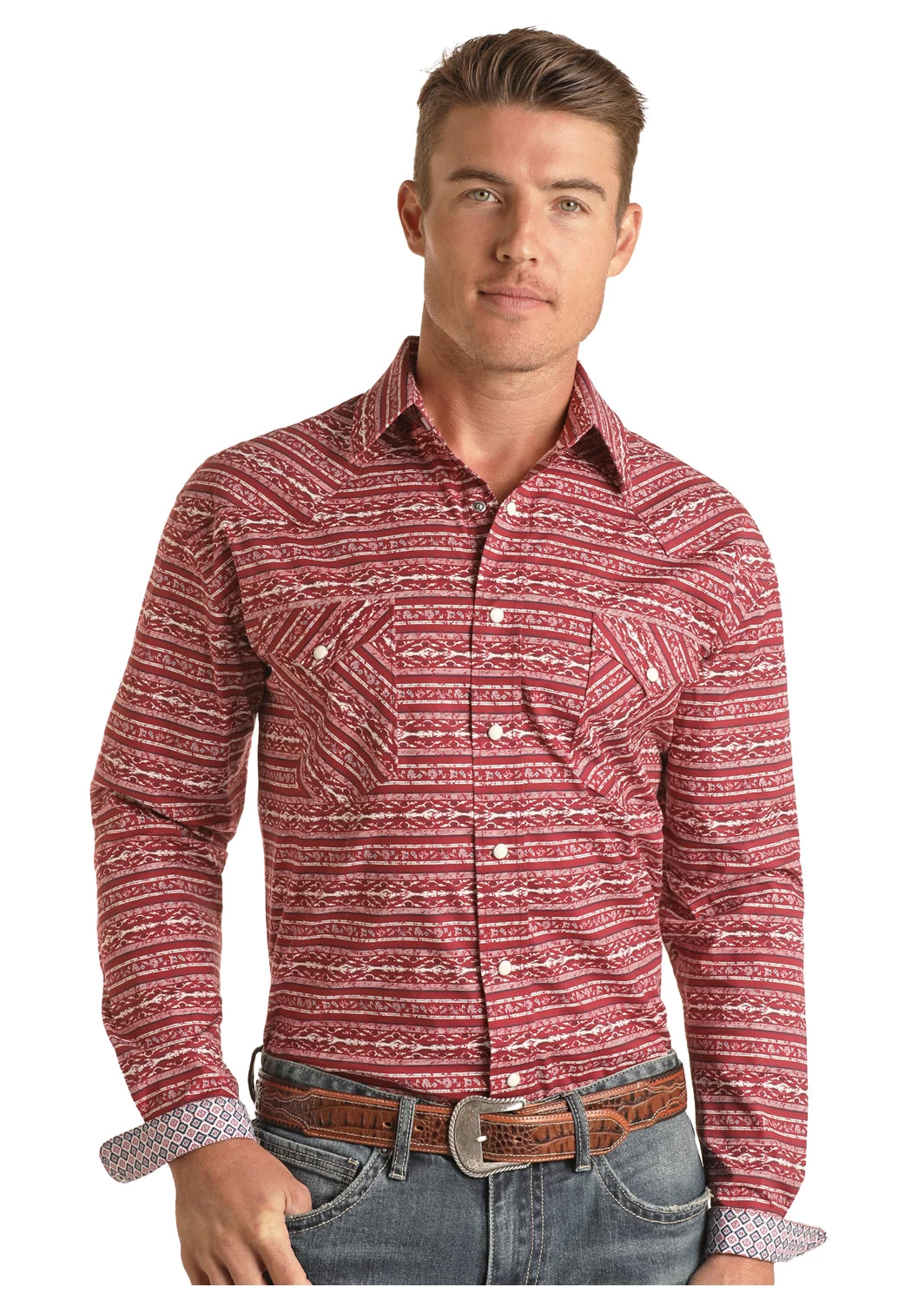 Red and White Abstract Stripe Long Sleeve Snap Front Shirt.