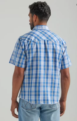 Medium Blue Plaid Short Sleeve Snap Front Shirt.